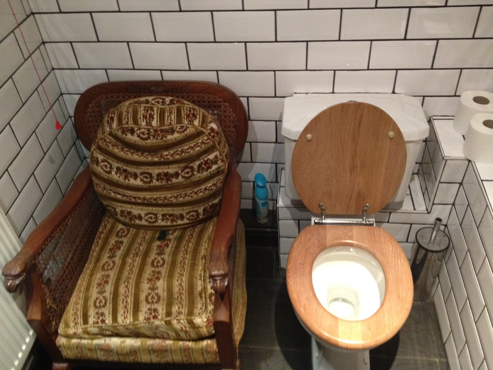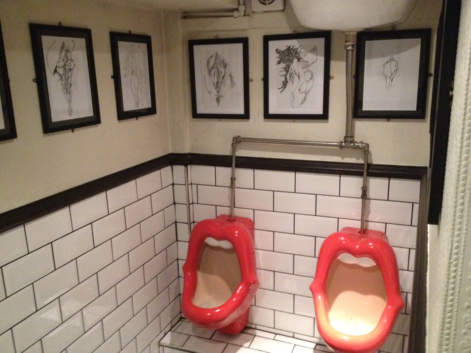 Finally there is the large disabled toilet with baby changing facilities. Right next to the loo is a chair stolen from your granddad and then on the surrounding walls is pictures of women with gigantic erect penises. Once you digest this you grasp that this is inexplicably on the money.