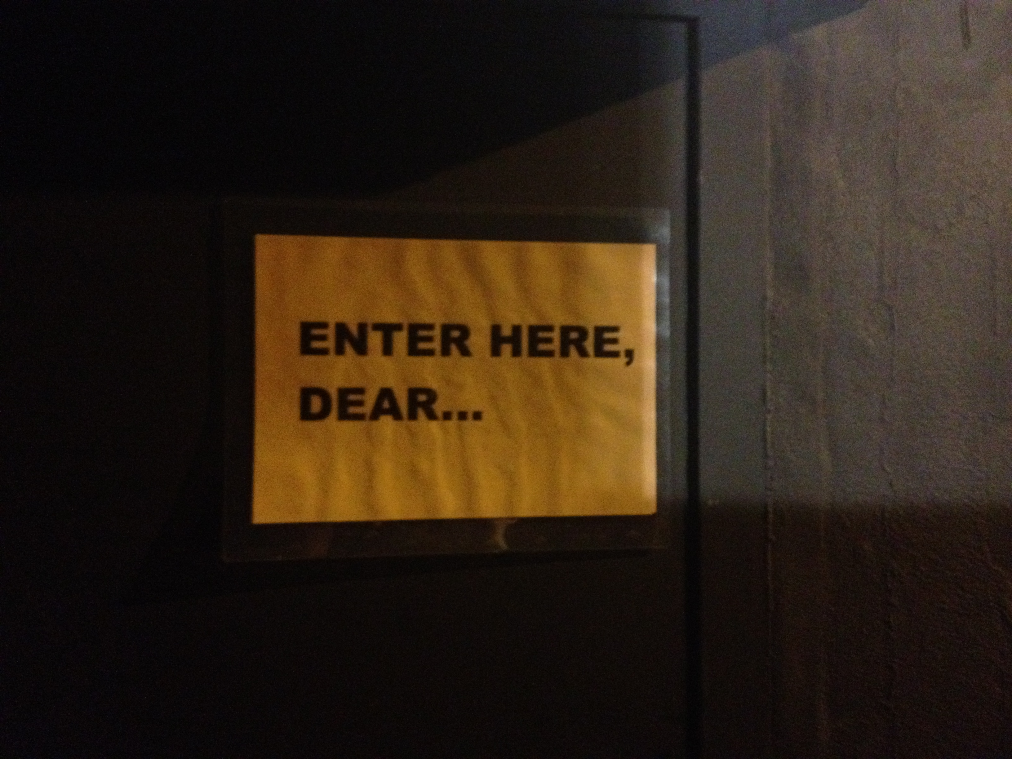 Given that a restroom visit was preceded by handling heavy weaponry, seeing this on the second double door to enter the loo had me under the impression I may well have to grapple with an oversexed granny that had baguettes for arms and would go straight for my belt.