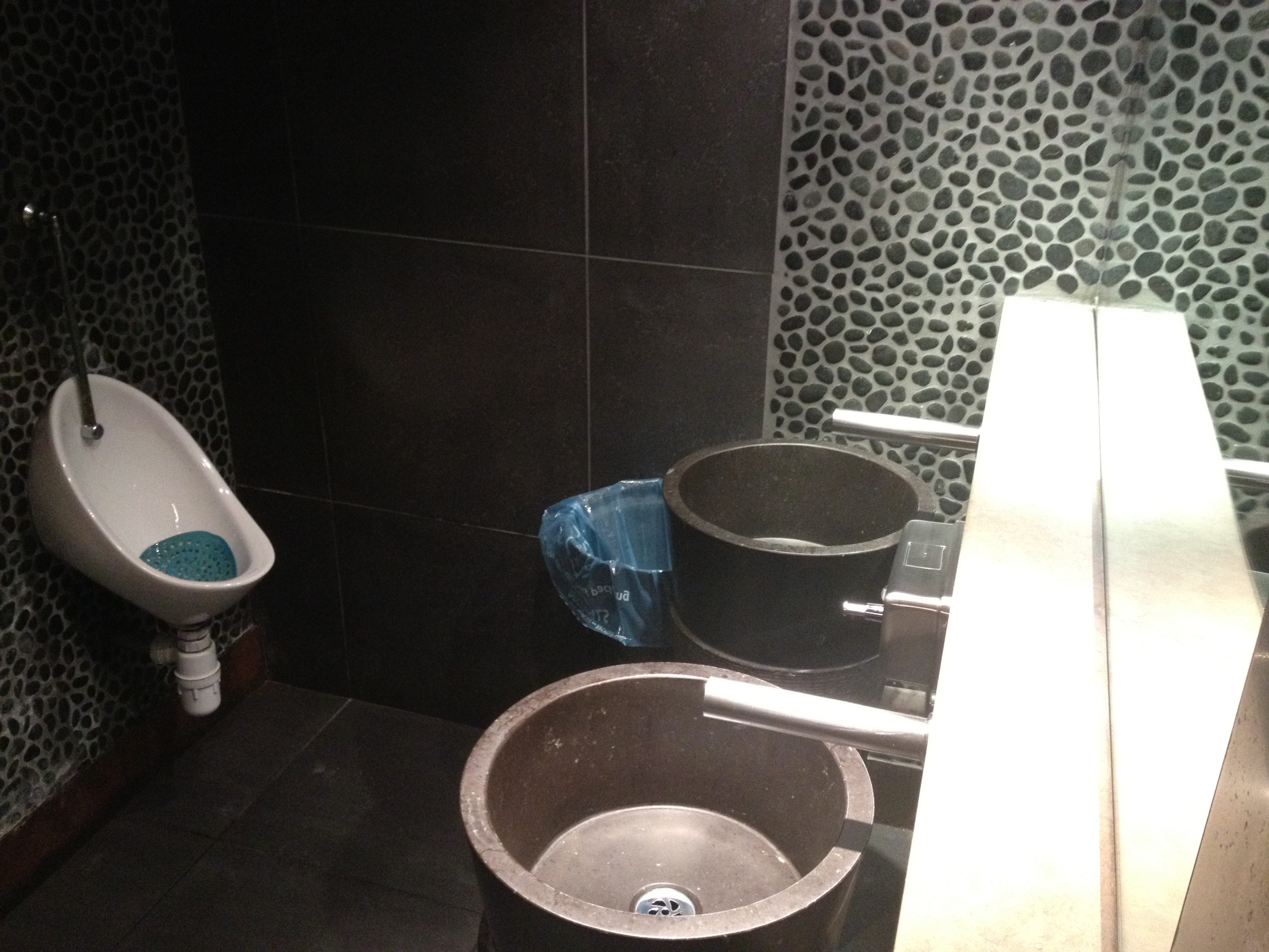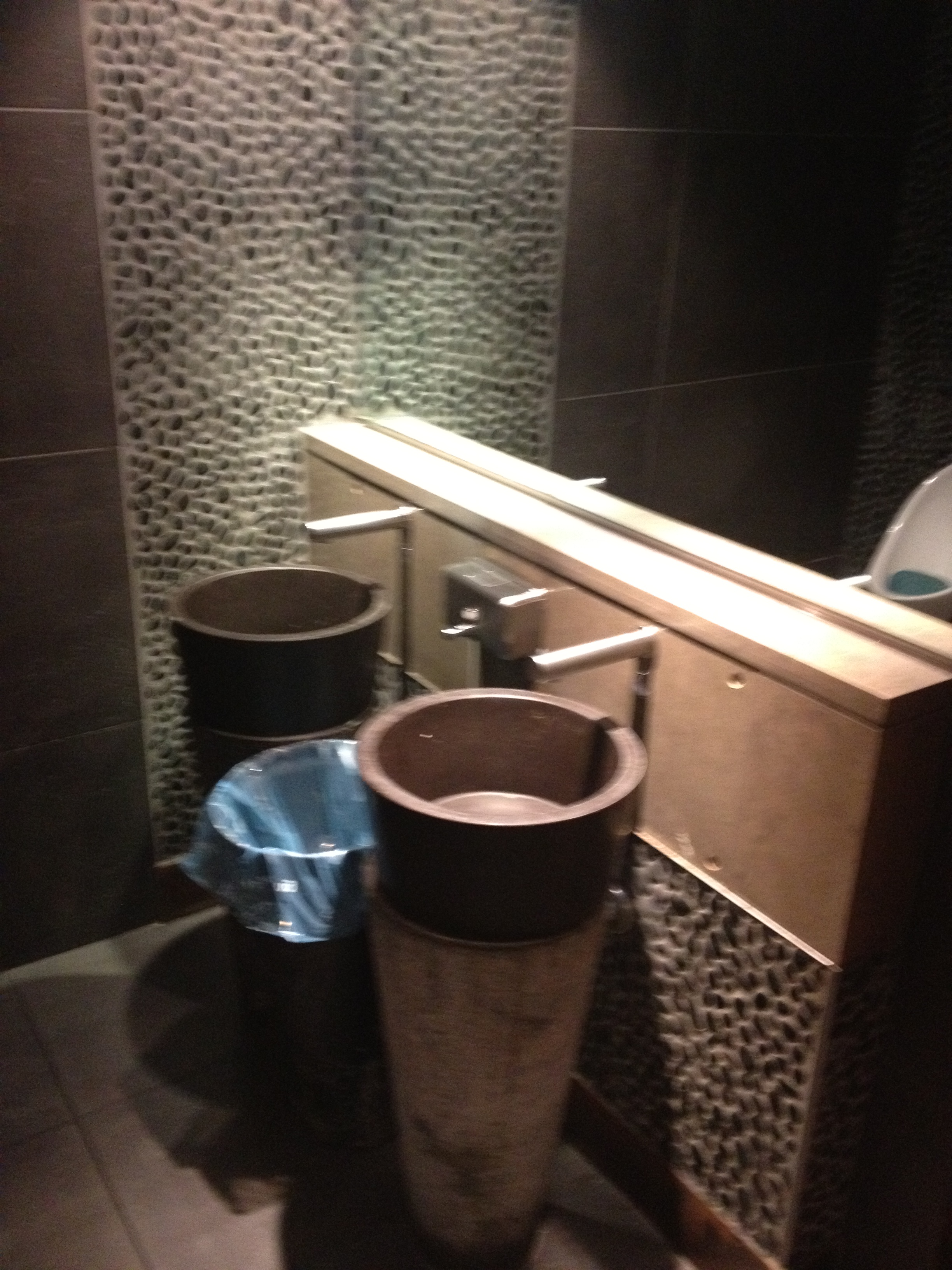 The sinks look like ceramic ice cream cones. Rather strange, and somewhat how I imagine an estate agent’s dream bathroom may look like, but again, it works.