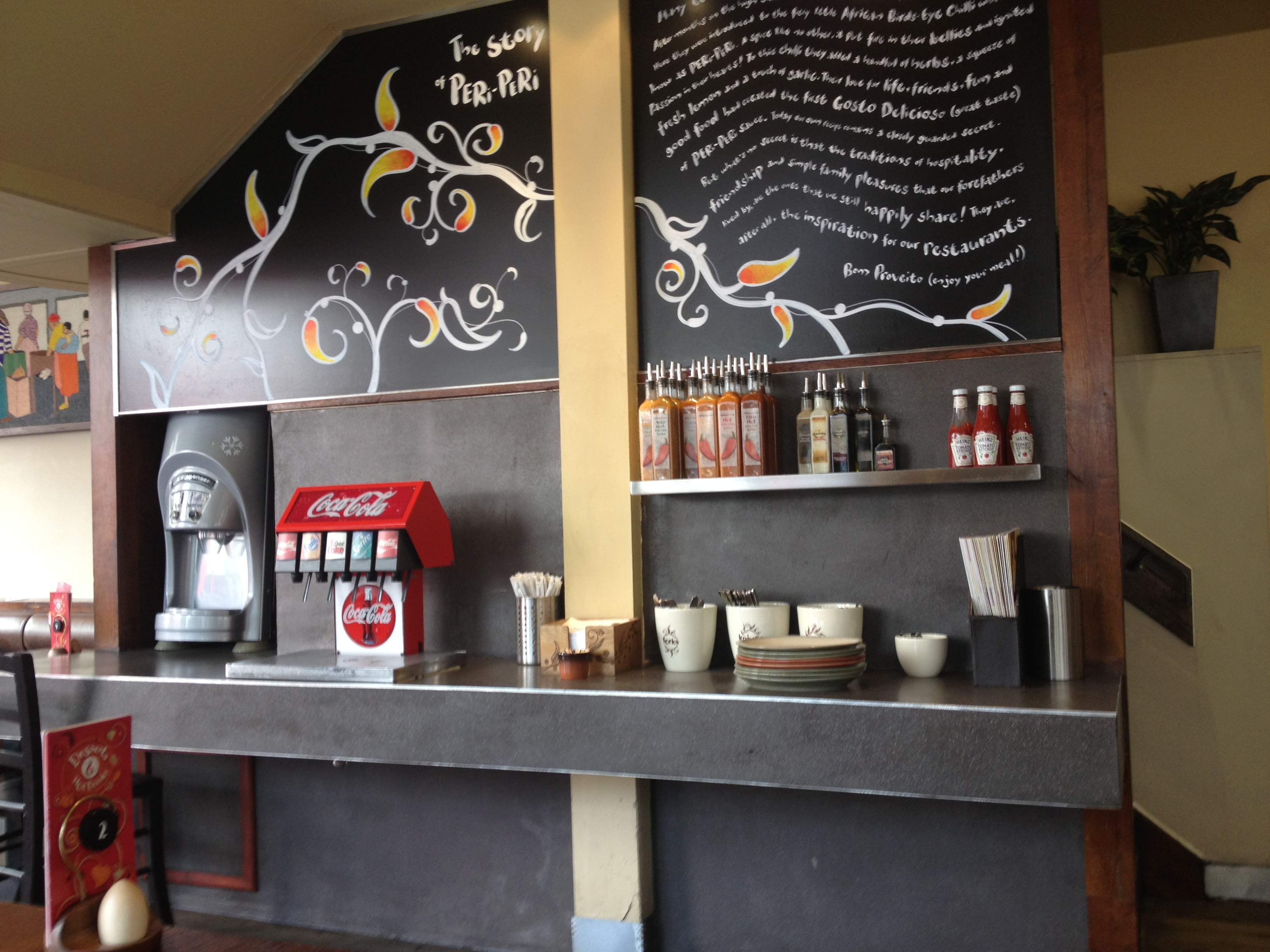 The garish, chipped white tiles one expects inside a chain is replaced with a sleek, dark pebble dash effect. In a suburban cul de sac of middle England, pebble dash may well be the first warning sign that you should run, but in the context of Nando’s, it works.