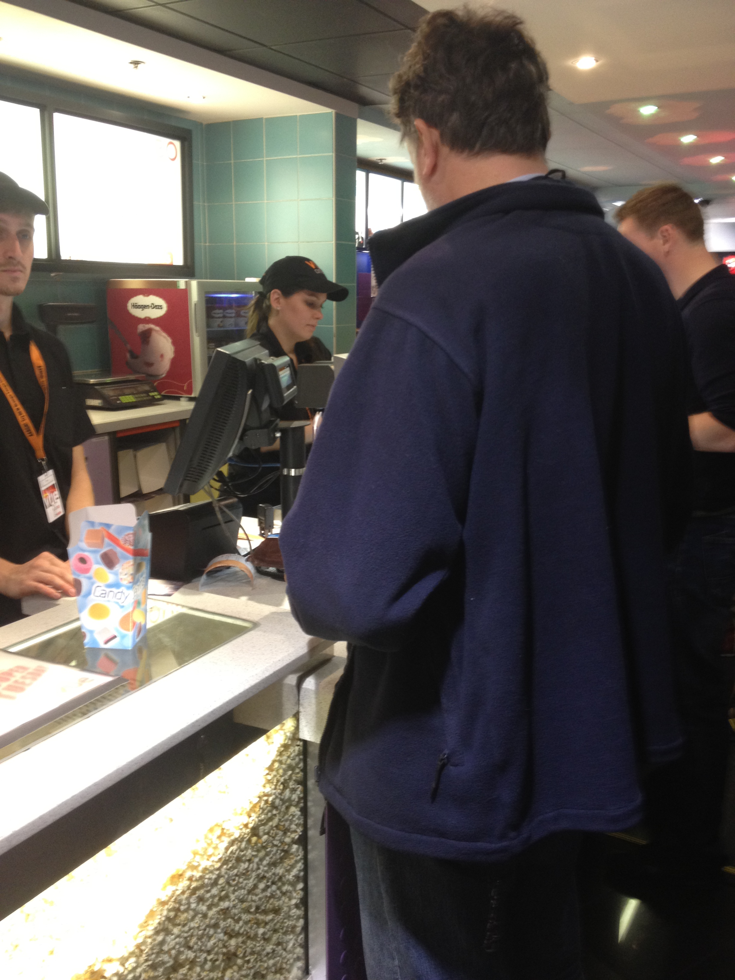 As ever though, actions speak with far more conviction and pertinence than any utterance and a chap (pictured), at the cinema on his own, of an age where pic’n’mix should have lost some of its pre-teen shine, loaded up his bucket of sugary trinkets and quaffed them, whilst waiting for his popcorn to be served, with such ferocity that he ended up having to simply pay for the empty pot. This remarkable turn of events could surely only occur under a circumstance of elated importance: the ‘big screen’.