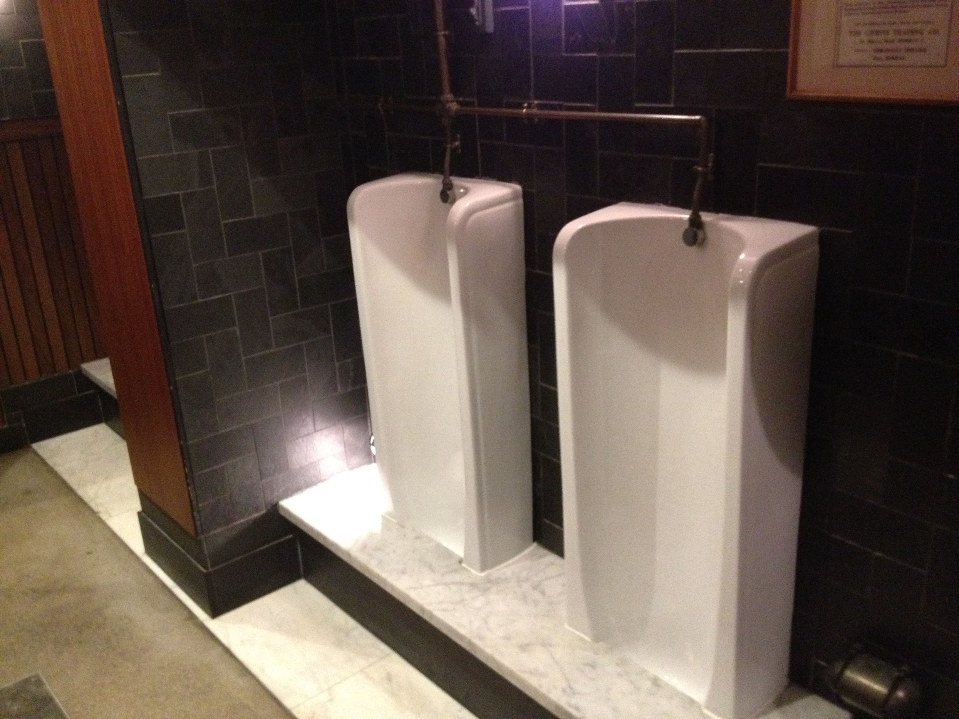 The attention to detail and restoration of toiletry timepieces is exquisite. The first thing one notices upon entry if the restored urinals that are framed with a marble step. These are surrounded by original pipework that has been developed with an eye to ensuring a fascia of cleanliness, whilst also paying requisite attention to the fact that such techniques of pipe welding were used in a manner that was specified to last, as oppose to modern day plumbing techniques which work like some leaky panhandler always accosting you for more money as they fail to deal with even the slightest climatic variance.