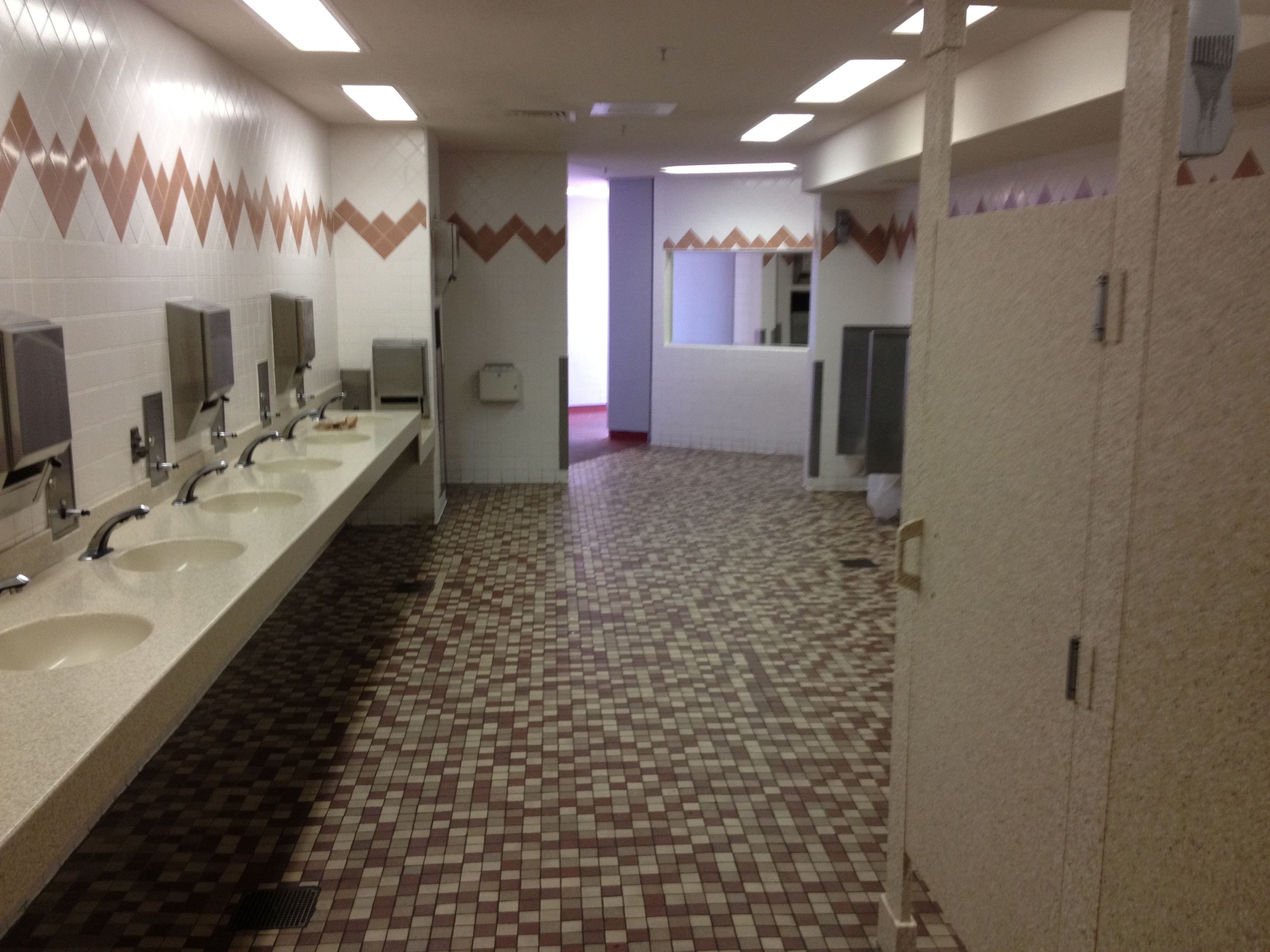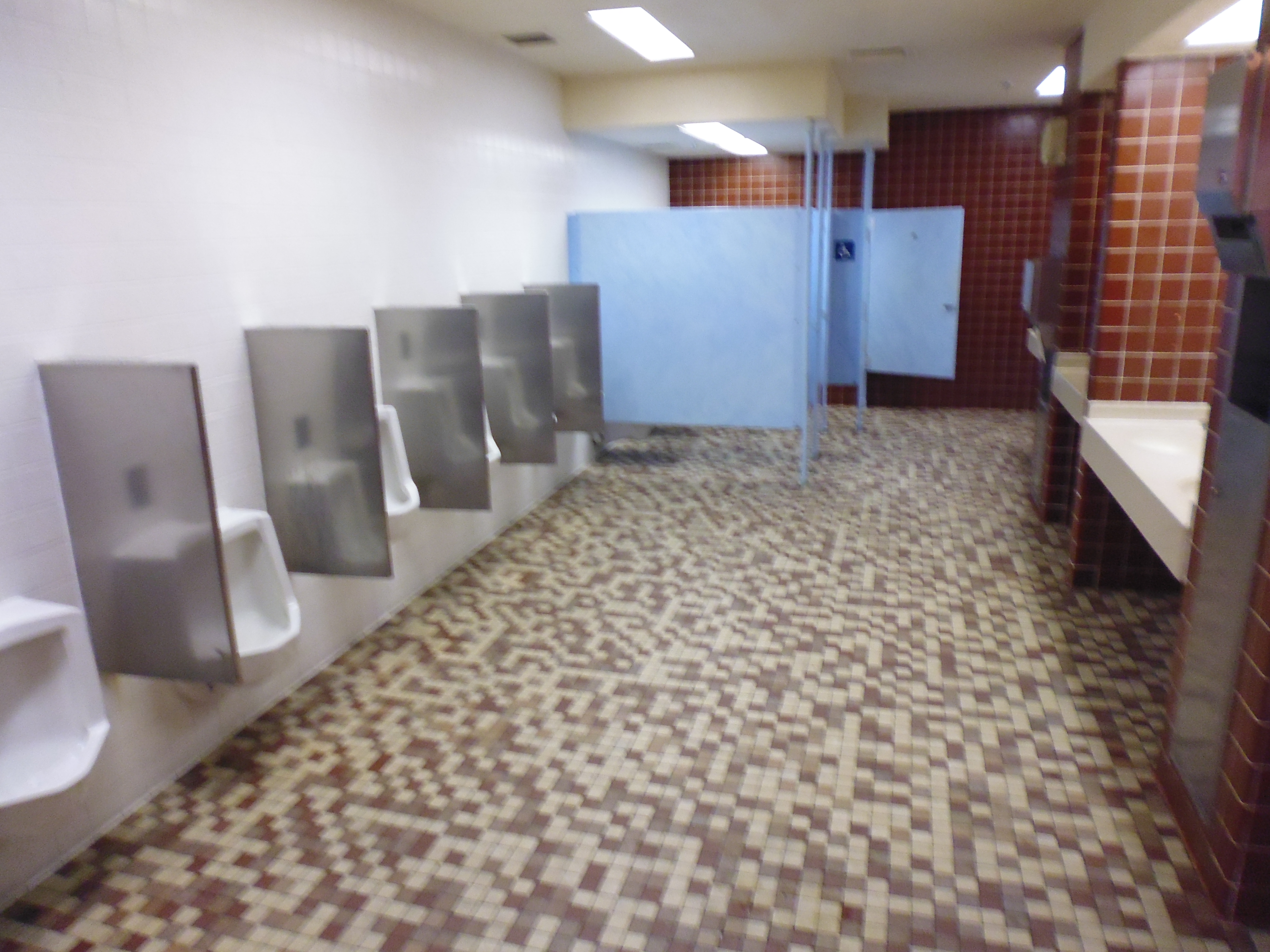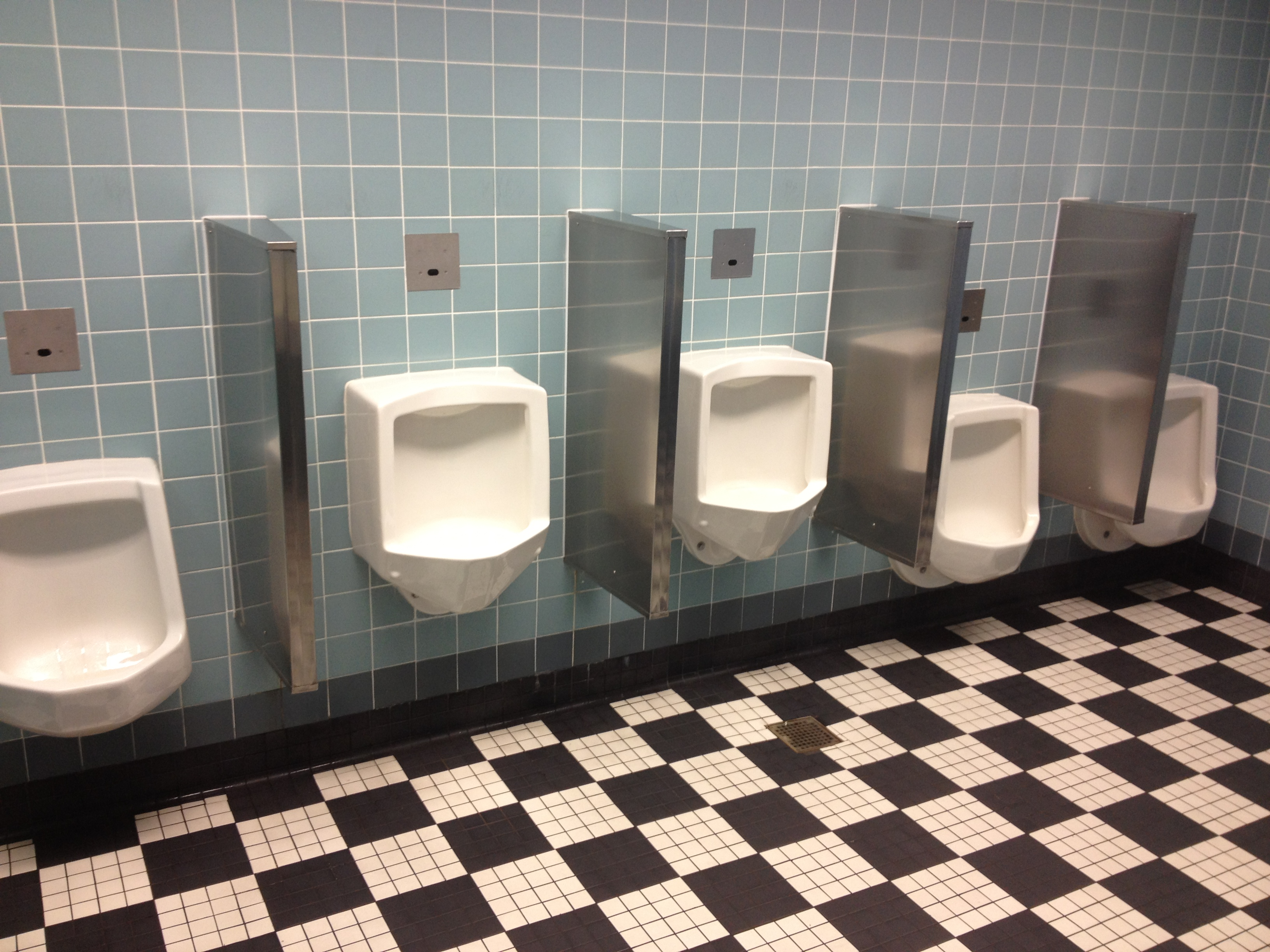 Televisions were by the urinals, the sinks, placed over the stalls. You literally did not miss a thing throughout the whole bathroom rigmarole.