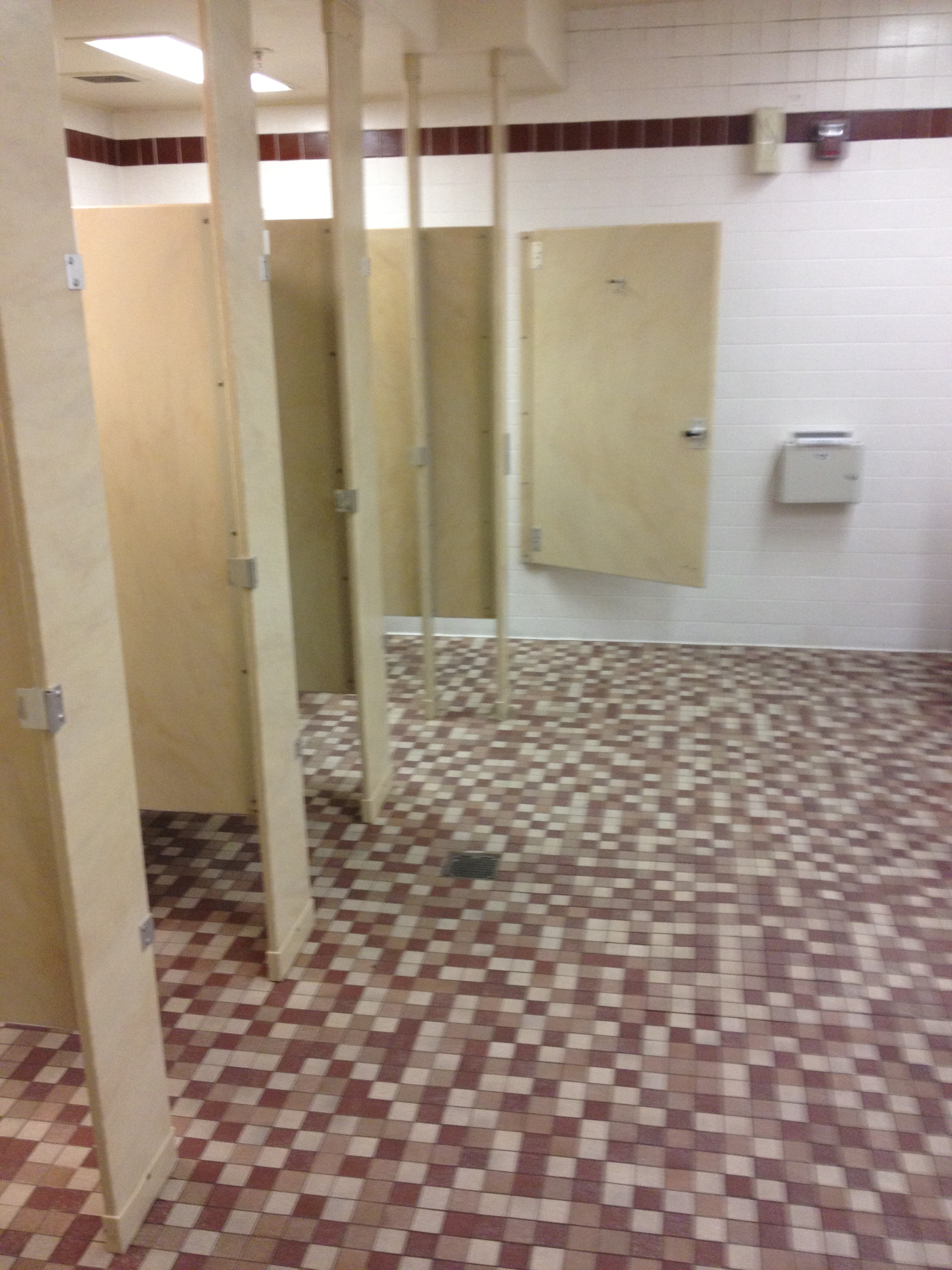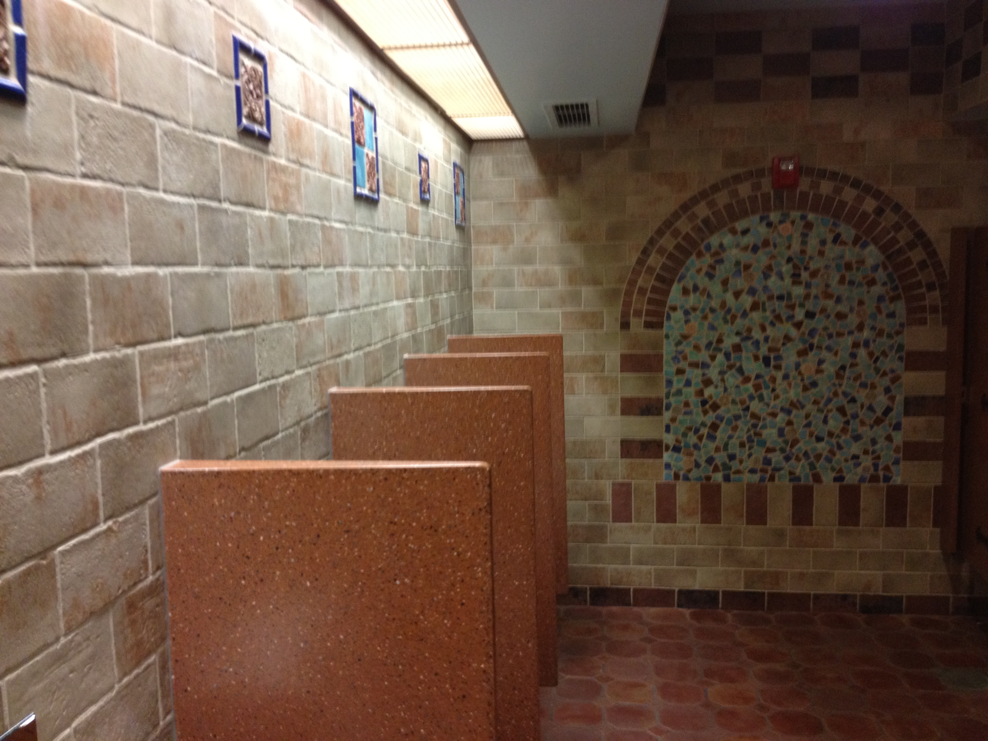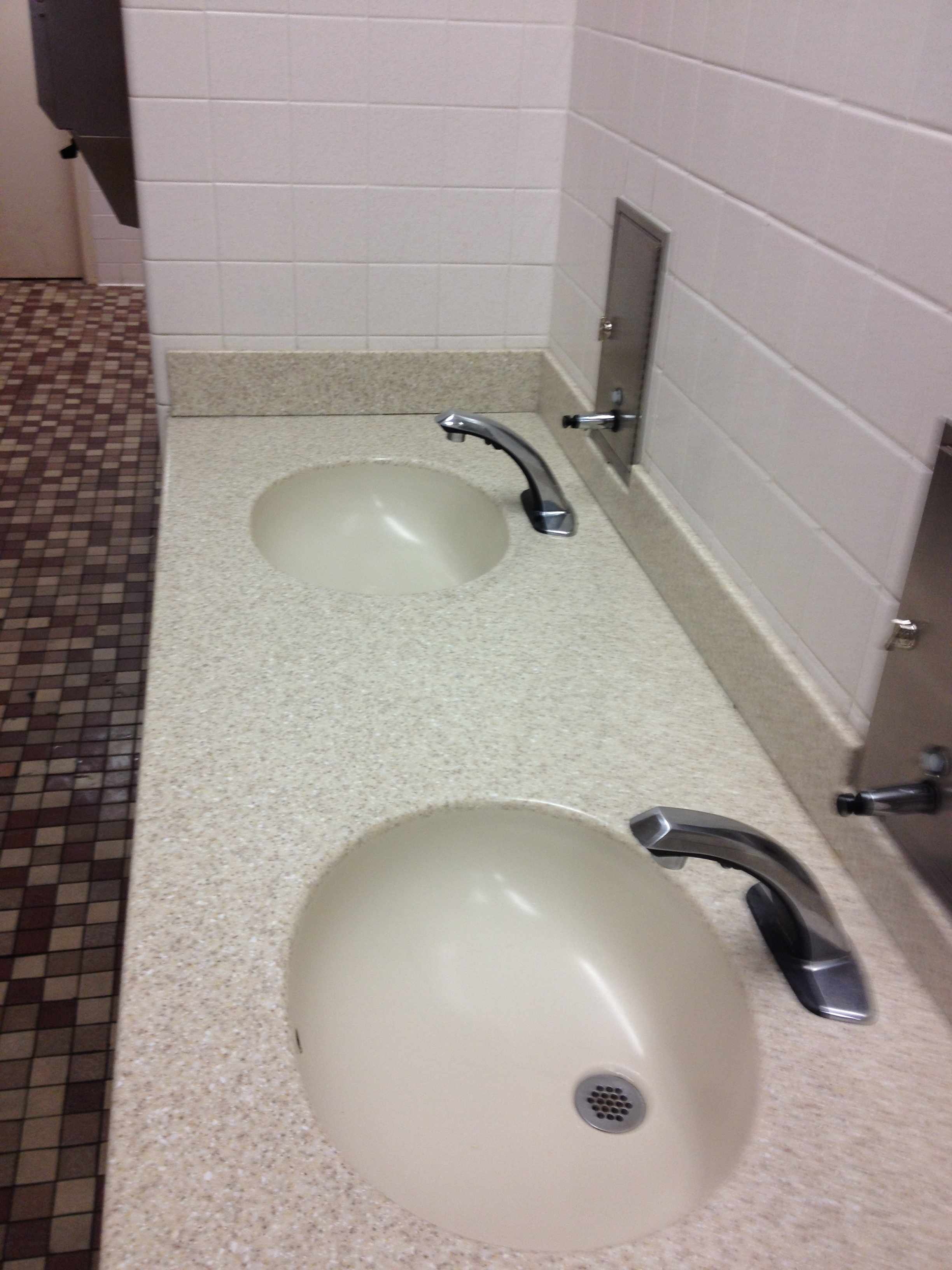 Televisions were by the urinals, the sinks, placed over the stalls. You literally did not miss a thing throughout the whole bathroom rigmarole.